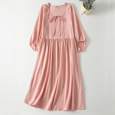 实拍2026春季新款宽松文艺风双层领口系带显瘦七分袖棉质连衣裙女