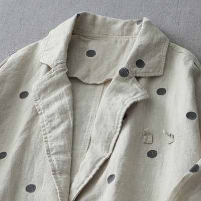 实拍2025春秋女亚麻波点文艺长袖外套日系宽松中长西装外搭薄风衣