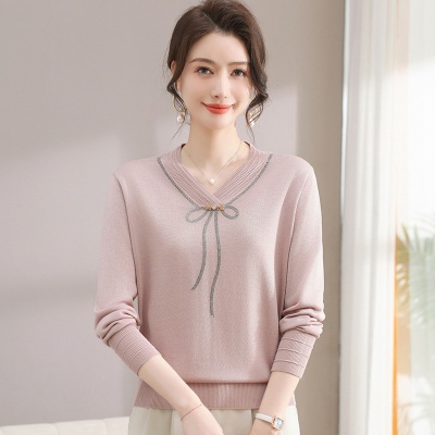春秋新款V领针织衫中年妈妈减龄打底衫T恤洋气百搭镶钻女装女毛衣