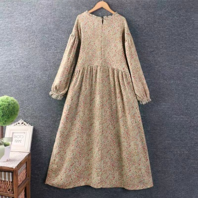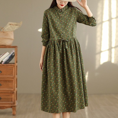 冬季新款加绒裙子2023休闲宽松棉麻小碎花收腰系带复古打底连衣裙