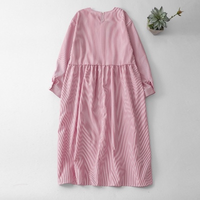 实拍2026春季新款海岸粉棉质柔美舒适休闲条纹圆领套头长袖连衣裙