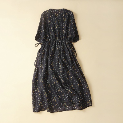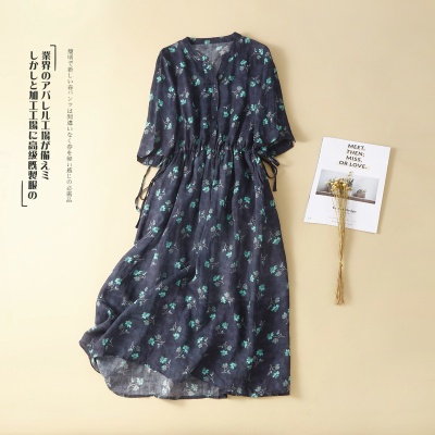系带苎麻V领七分袖棉麻连衣裙女新款夏收腰显瘦文艺气质碎花长裙