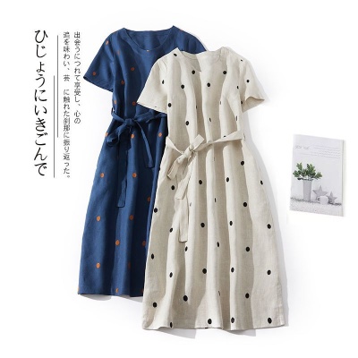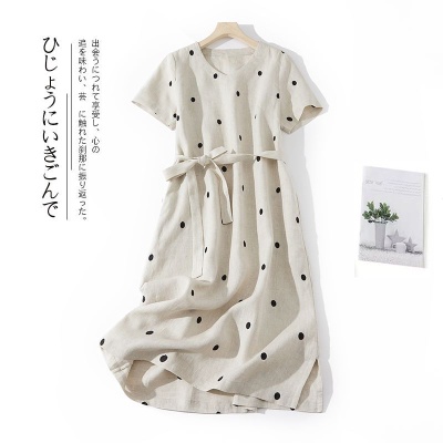 2024夏新款棉麻印花文艺波点小个子中长连衣裙系带收腰显瘦短袖裙