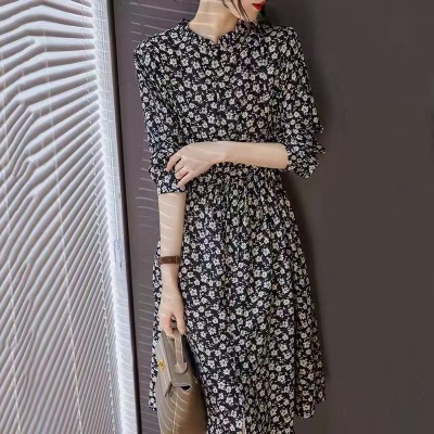 2025春新款女装日系小清新圆领棉麻长袖连衣裙碎花宽松叠穿中长裙