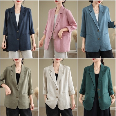 实拍2025年春秋新款棉麻文艺宽松西装领长袖小西服休闲外套上衣女