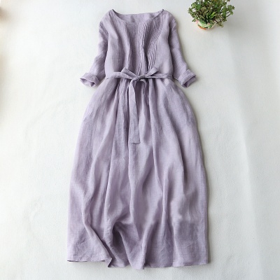 系带收腰显瘦五分袖连衣裙女2023夏季新款棉麻文艺优雅风琴褶裙子