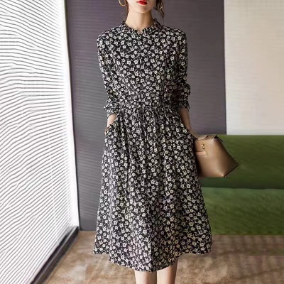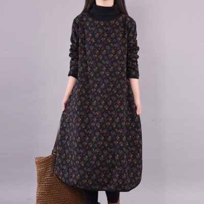2024秋冬新款韩版宽松大码女装中长款加绒加厚高领小碎花连衣裙女