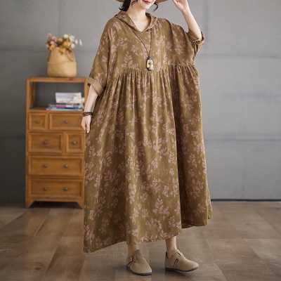 实拍2025春文艺气质复古印花连帽高腰连衣裙宽松大摆娃娃裙大码裙
