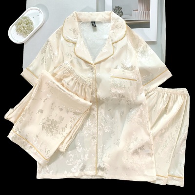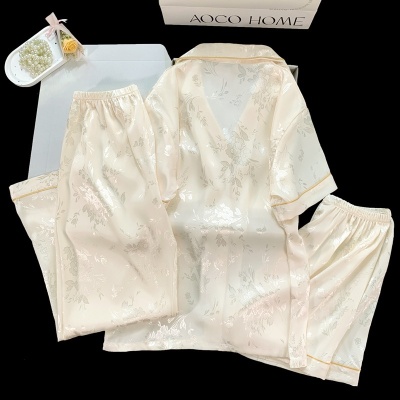 实拍#冰丝带胸垫睡衣三件套女士家居服套装国风轻奢女士睡衣套装