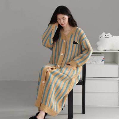 冬季新款加厚半边绒条纹V领开衫睡裙女家居服
