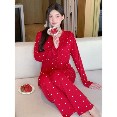 莫代尔睡衣女春秋季带胸垫爱心长袖本命年红色家居服套装