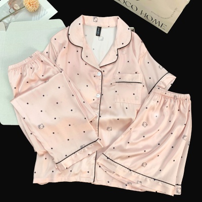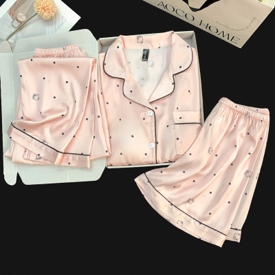 实拍#冰丝带胸垫睡衣三件套女士家居服套装开衫波点KT猫卡通少女