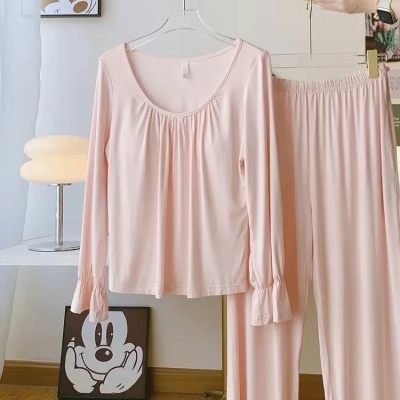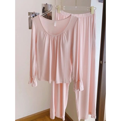 带胸垫蕾丝长袖莫代尔睡衣女薄款可外穿家居服两件套少女简约宿舍