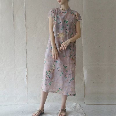 山茶花中式斜襟棉麻宽松改良旗袍遮肚年轻款少女2025新款连衣裙
