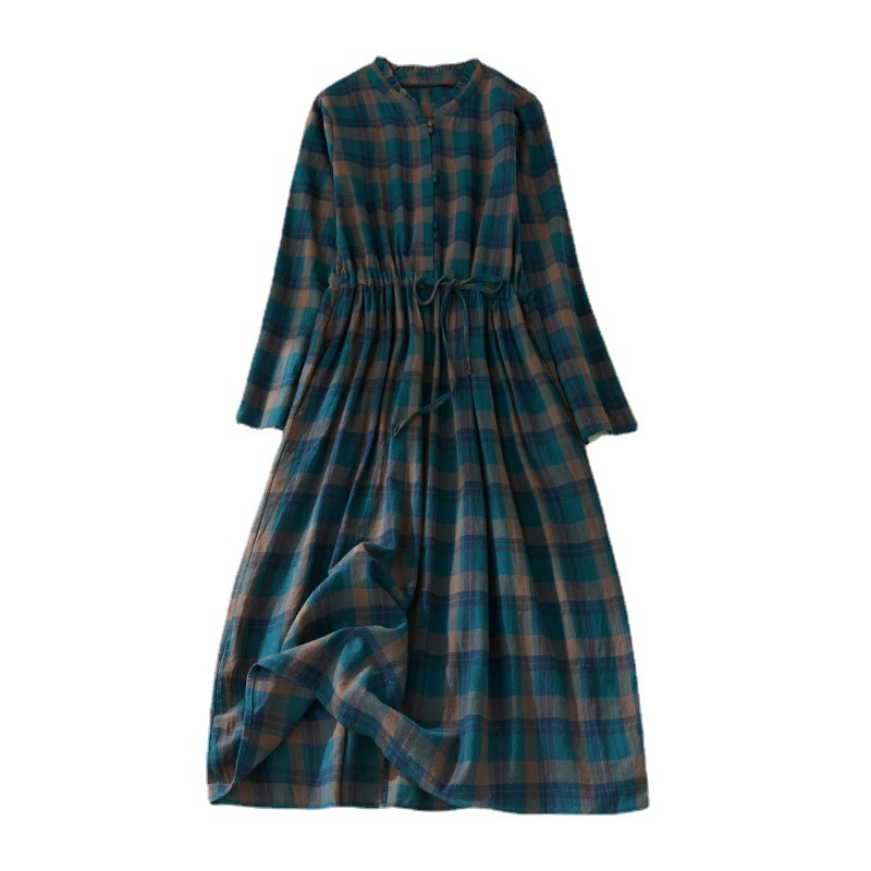 秋装新款大码女装复古收腰显瘦系带花边领长袖中长款格子连衣裙女