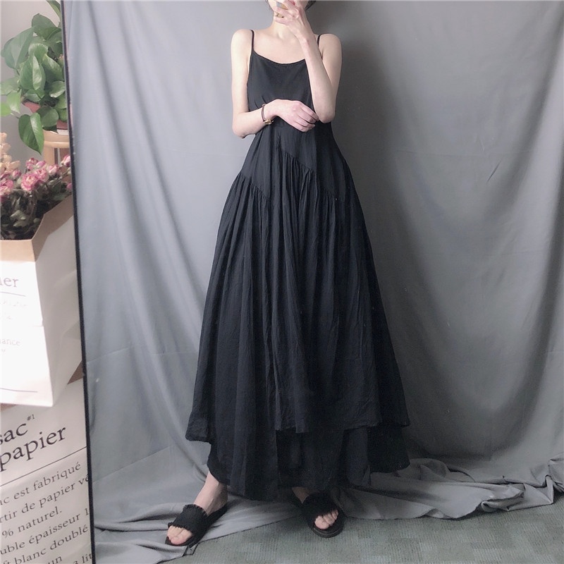 黑白超长不规则大摆吊带连衣裙女2024夏季新款文艺清新气质长裙子