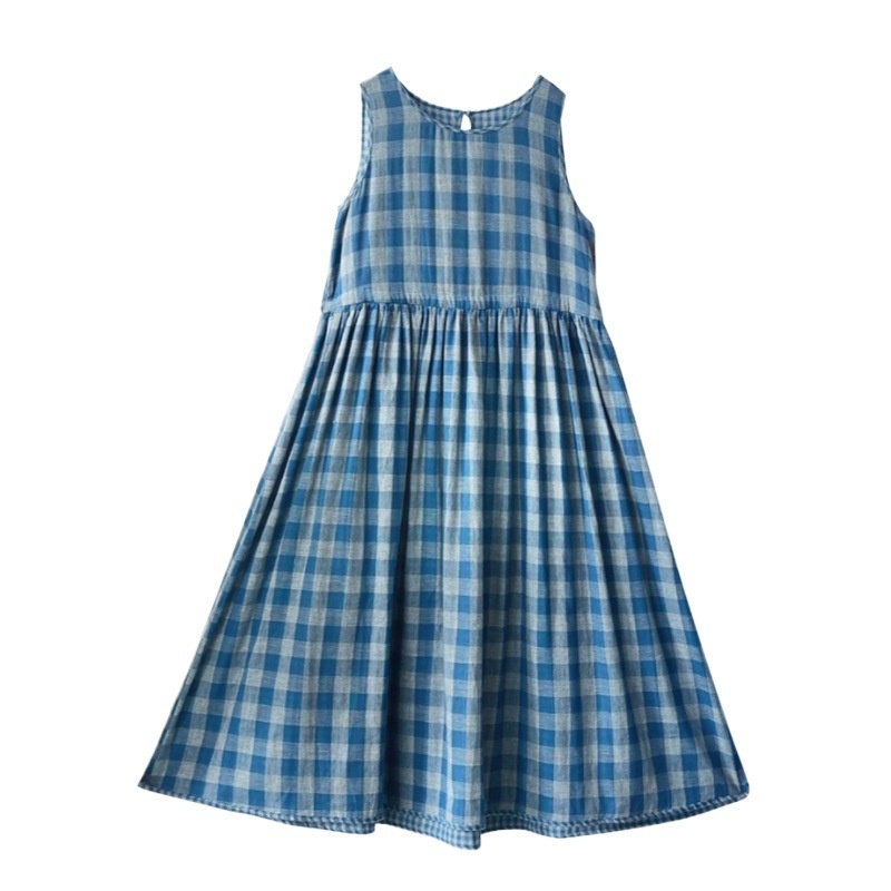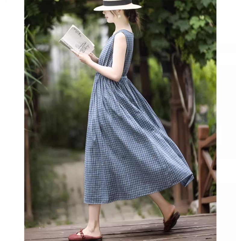 商品名称:2025夏季新款纯棉双层纱圆领格子长裙设计感小众文艺无袖连衣裙女
