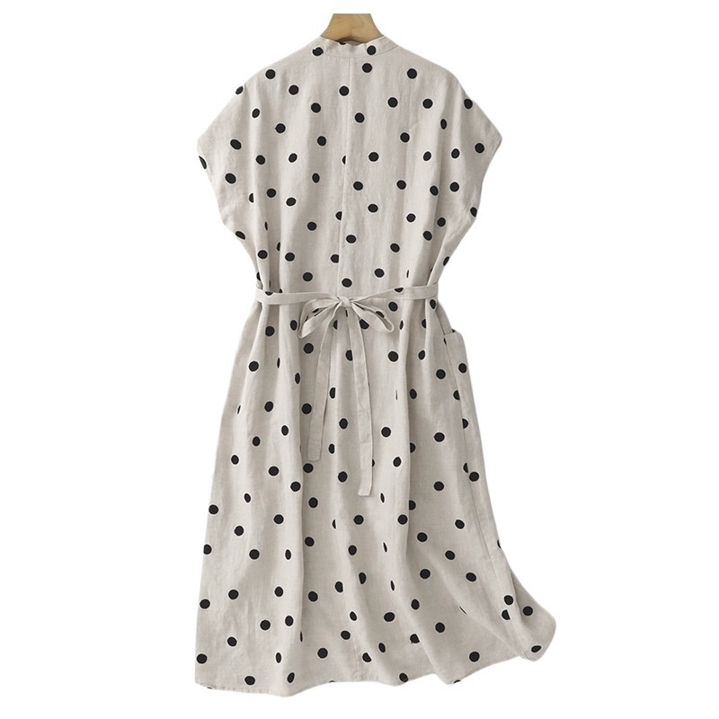 棉麻波点连衣裙女夏新款复古V领收腰显瘦气质中长裙A字裙