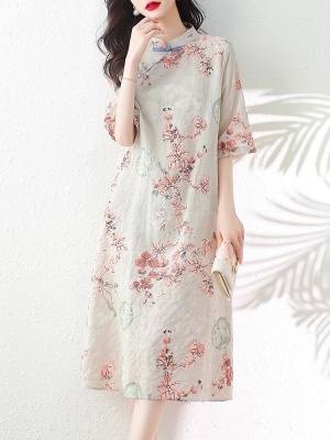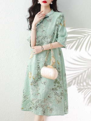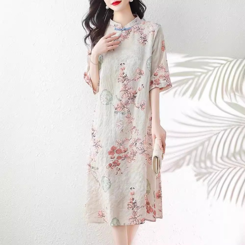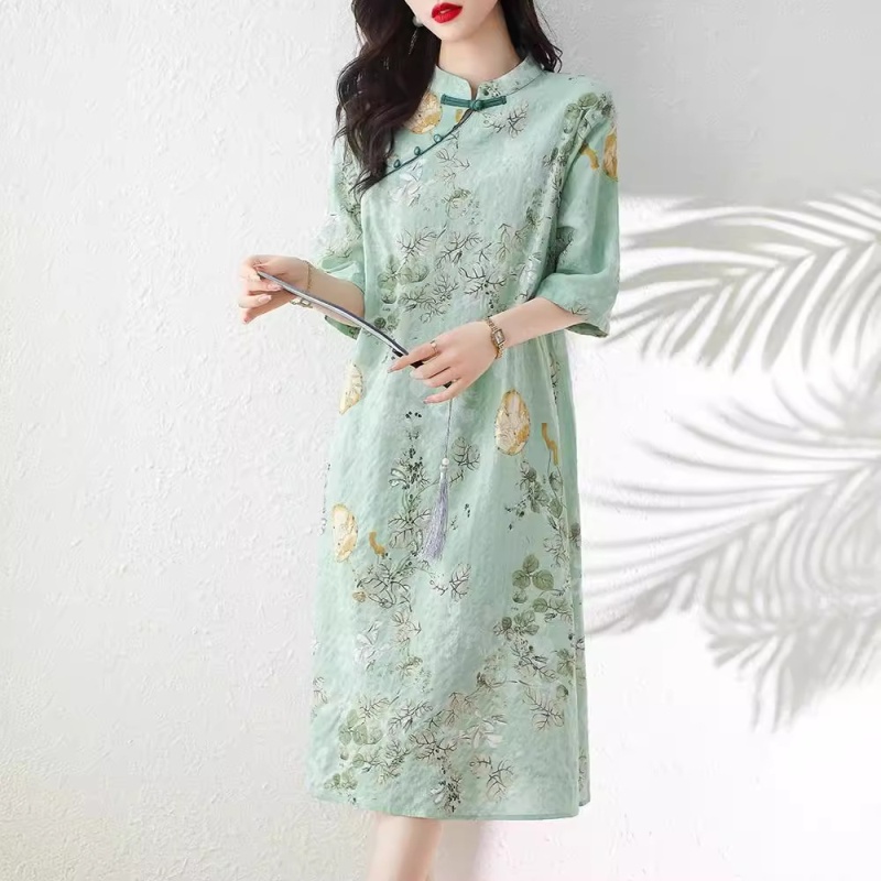 2024夏季新款气质复古印花国风斜襟立领棉质连衣裙改良旗袍长裙女