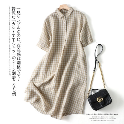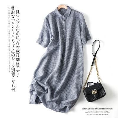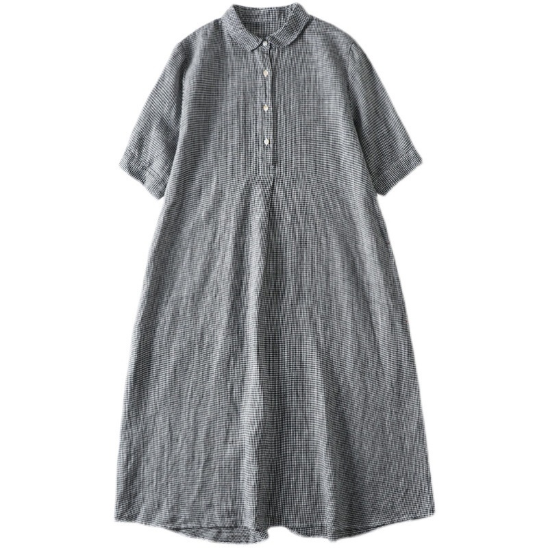 日系色织亚麻格子连衣裙女2024夏新款复古休闲造型下摆宽松长裙子