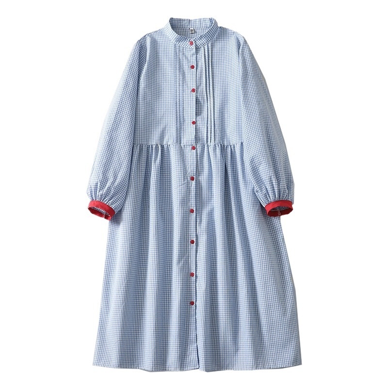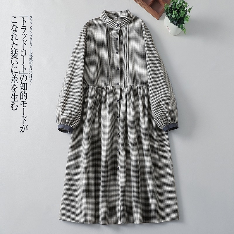 2025春季新款日系文艺格子长袖衬衫连衣裙女宽松显瘦立领棉麻长裙