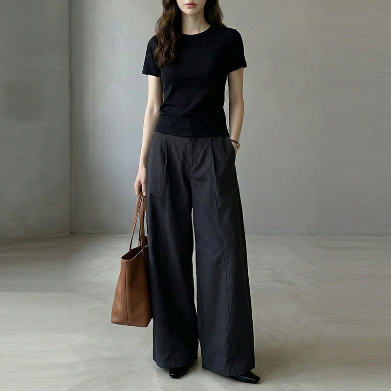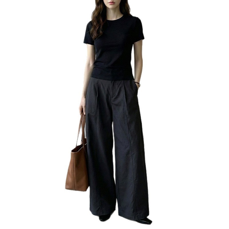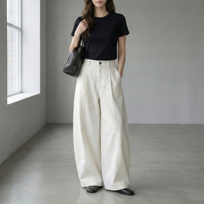 云长 春季新款弯刀裤女高腰显瘦宽松阔腿休闲长裤带纽扣现货批发