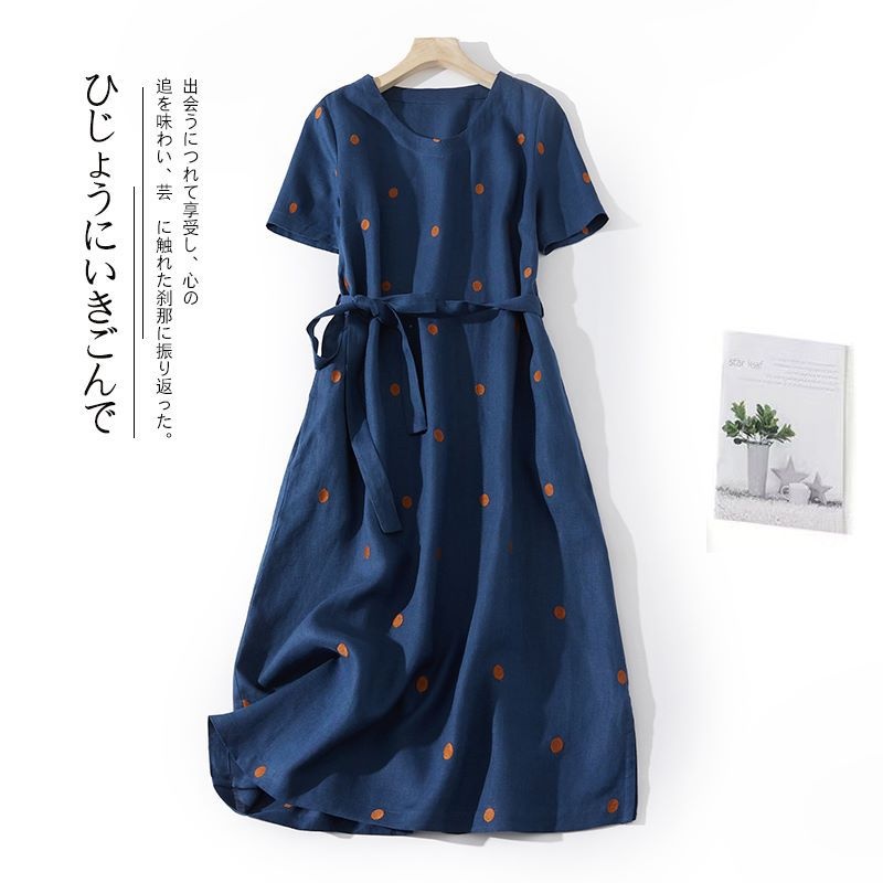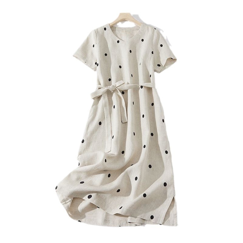2024夏新款棉麻印花文艺波点小个子中长连衣裙系带收腰显瘦短袖裙