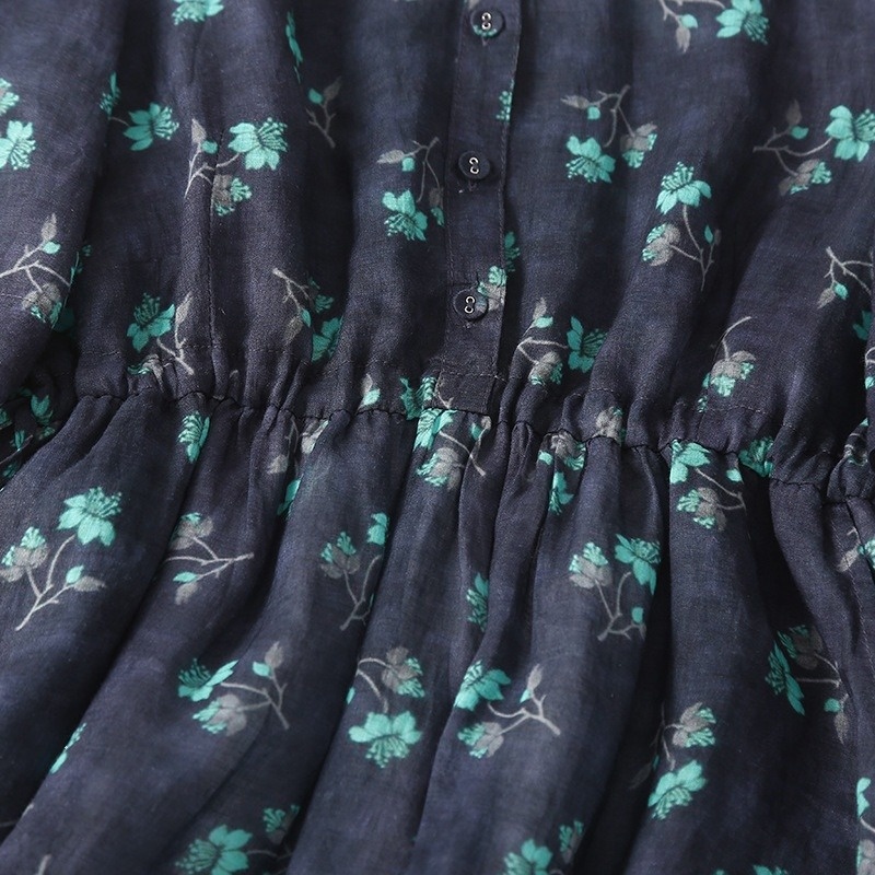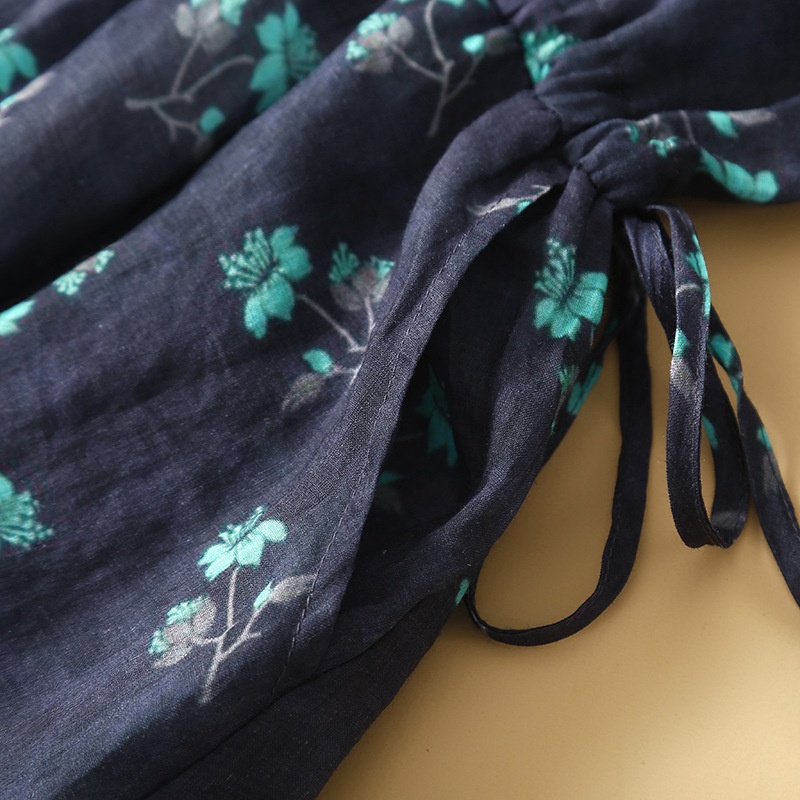 系带苎麻V领七分袖棉麻连衣裙女新款夏收腰显瘦文艺气质碎花长裙