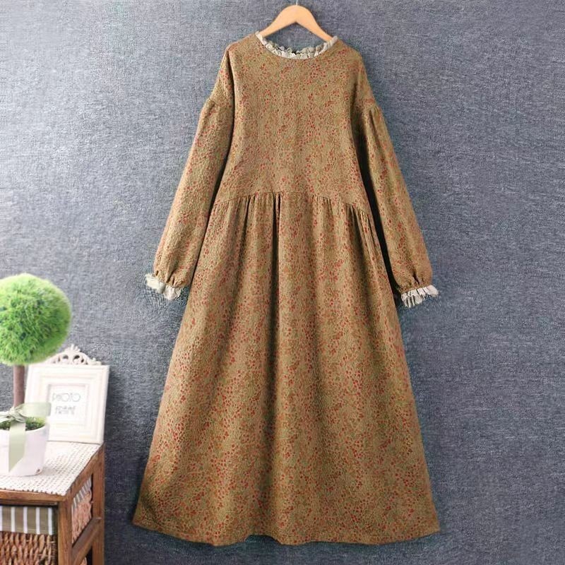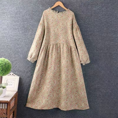 2025春新款女装日系小清新圆领棉麻长袖连衣裙碎花宽松叠穿中长裙