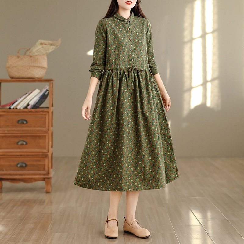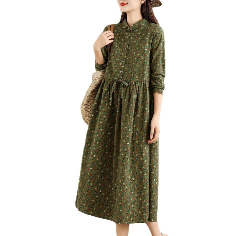 实拍森系文艺翻领长袖连衣裙2025秋装棉质磨毛碎花裙中长款衬衫裙