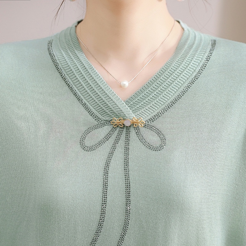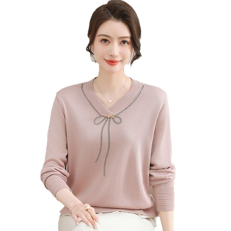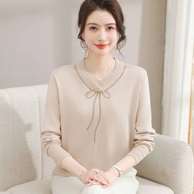 商品名称:春秋新款V领针织衫中年妈妈减龄打底衫T恤洋气百搭镶钻女装女毛衣