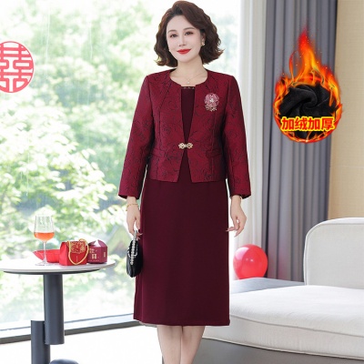 新款休闲妈妈礼服加绒连衣裙套装中老年女春秋冬两件套婆婆婚宴