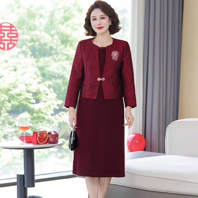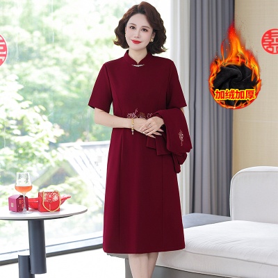 商品名称:新款休闲妈妈礼服加绒连衣裙套装中老年女春秋冬两件套婆婆婚宴