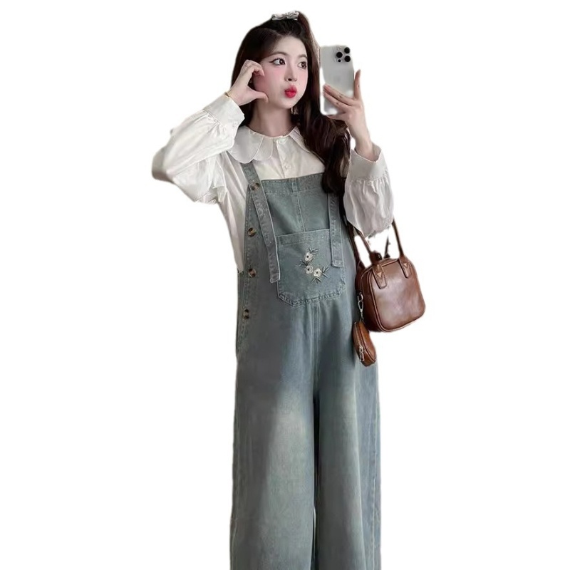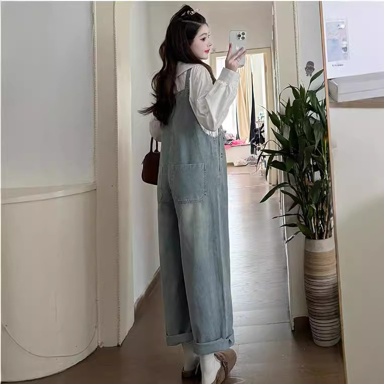 商品名称:孕妇牛仔背带裤时尚秋季新款韩版减龄娃娃领衬衣宽松休闲阔腿长裤