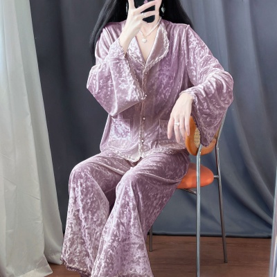 商品名称:春季新款金丝绒开衫长袖可外穿时尚风家居服套装保暖睡衣女