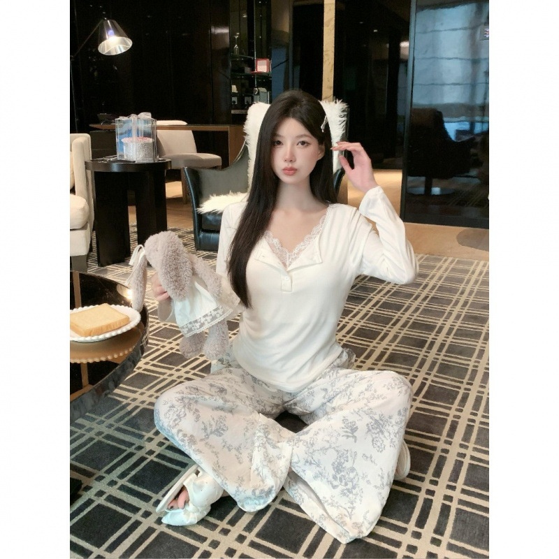带胸垫睡衣女春秋新款蕾丝莫代尔上衣梭织裤外穿家居服