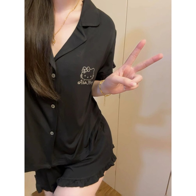 官图#夏季新款宽松舒适睡衣女KT猫烫钻小众家居服套装外穿