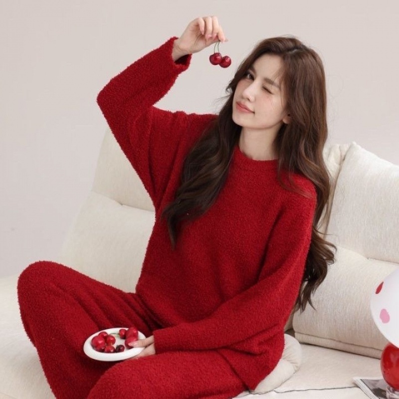 半边绒睡衣女冬季新款加绒加厚保暖纯色家居服套装可外穿