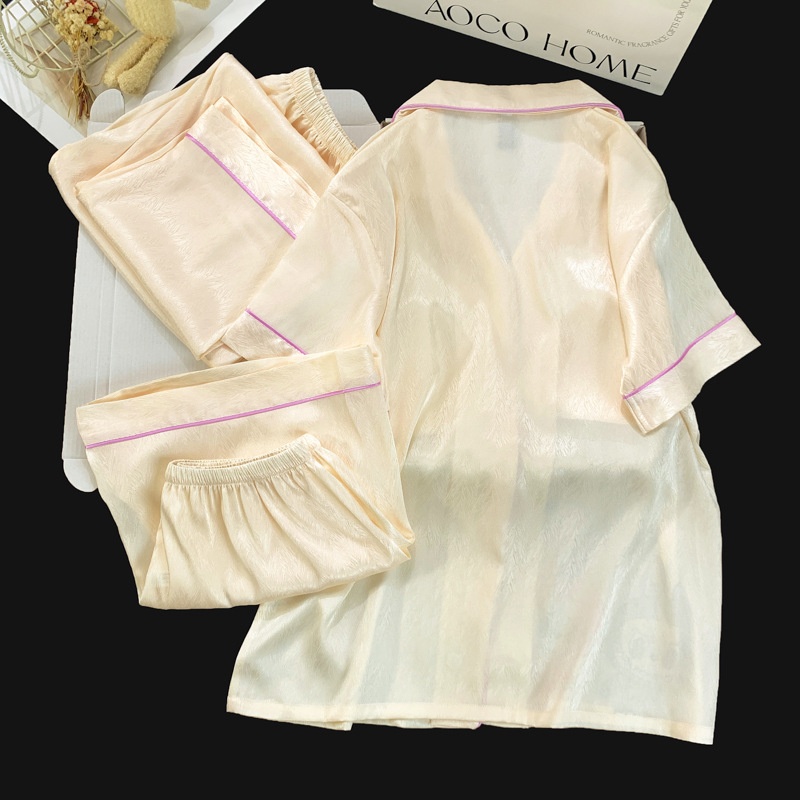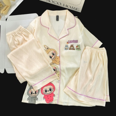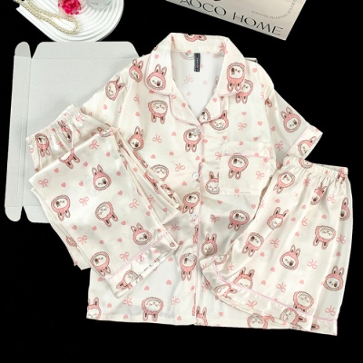 商品名称:实拍#冰丝带胸垫睡衣三件套女士家居服套装开衫拉布布杏色卡通