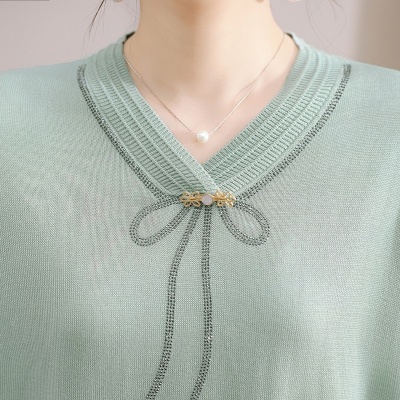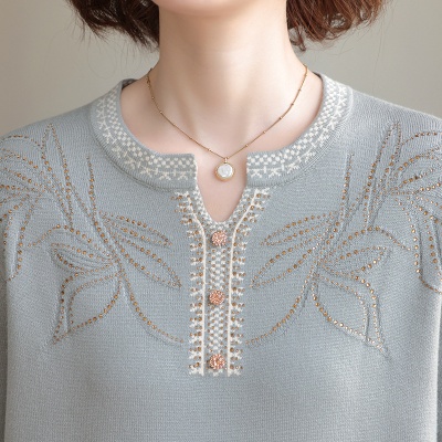 春秋新款V领针织衫中年妈妈减龄打底衫T恤洋气百搭镶钻女装女毛衣