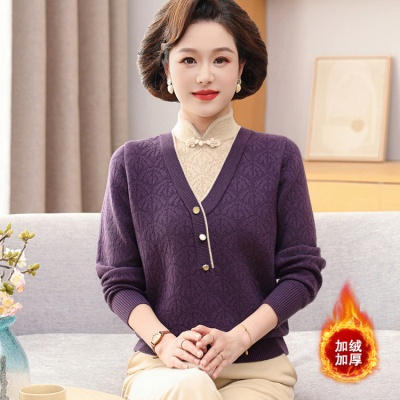 2024年春秋新款国风妈妈装洋气打底衫长袖毛衣中老年旗袍领针织衫