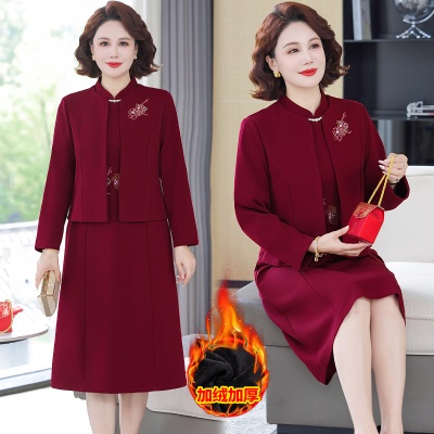 新款休闲妈妈礼服加绒连衣裙套装中老年女春秋冬两件套婆婆婚宴