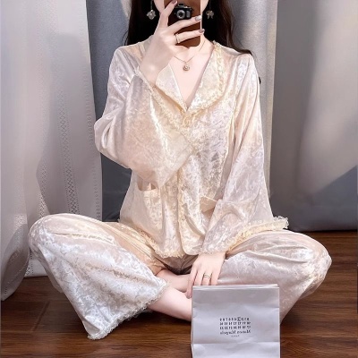 带胸垫睡衣女春秋新款蕾丝莫代尔上衣梭织裤外穿家居服