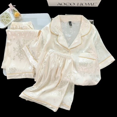 实拍#冰丝带胸垫睡衣三件套女士家居服套装国风轻奢女士睡衣套装