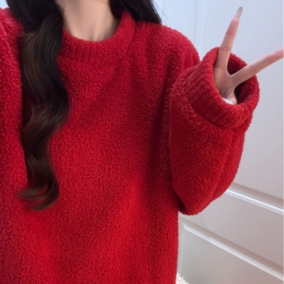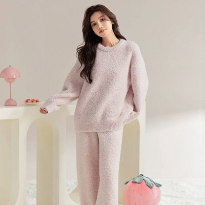 半边绒睡衣女冬季新款加绒加厚保暖纯色家居服套装可外穿