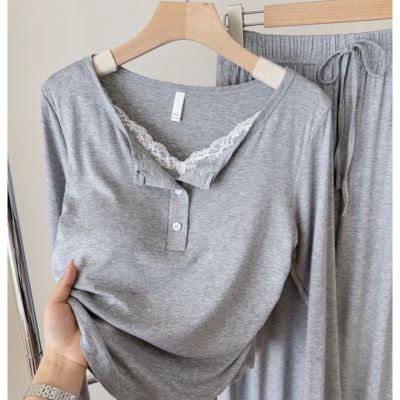 带胸垫蕾丝长袖莫代尔睡衣女薄款可外穿家居服两件套少女简约宿舍