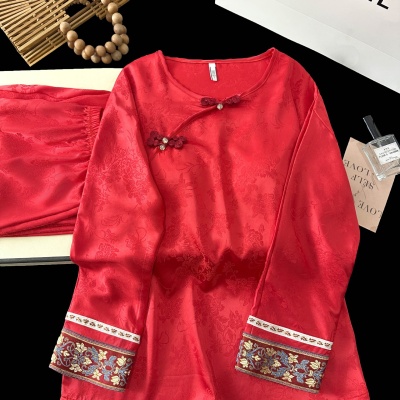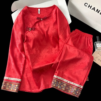 2025春季新款中国红新中式提花睡衣女长袖盘扣家居服套装高级感国
