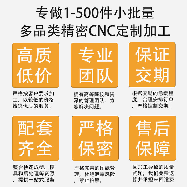 合作流程 | 1.提供样品/3D图档 2.客服报价 3.确认无误下单 4.安排上机加工 5.表面处理 6.质量检测 7.打包发货 8.确认收货 9.售后服务保障 |