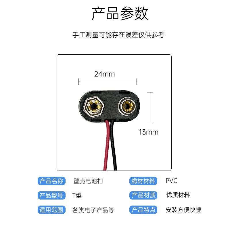 商品名称:定制T型9v电池硬扣 玩具仪器连接线夹铜线端子接头塑壳9v电池卡扣