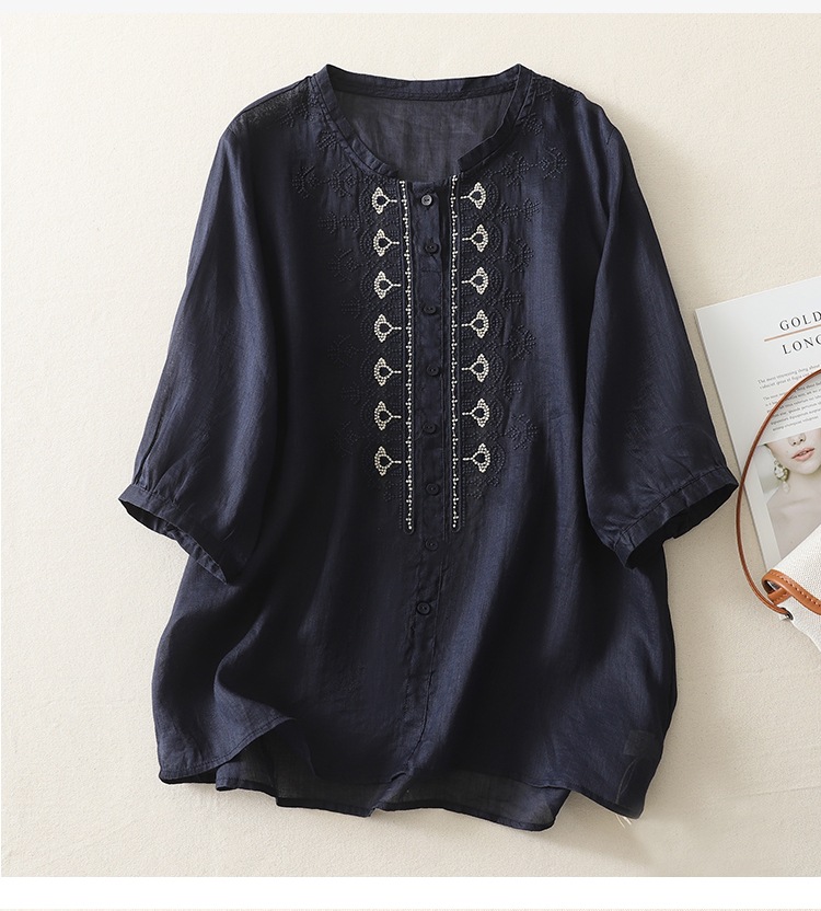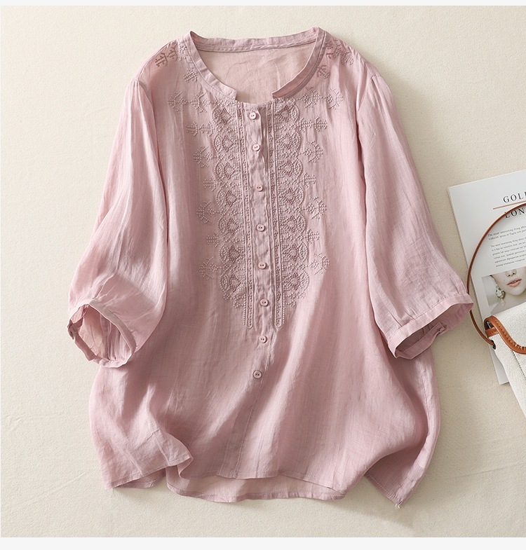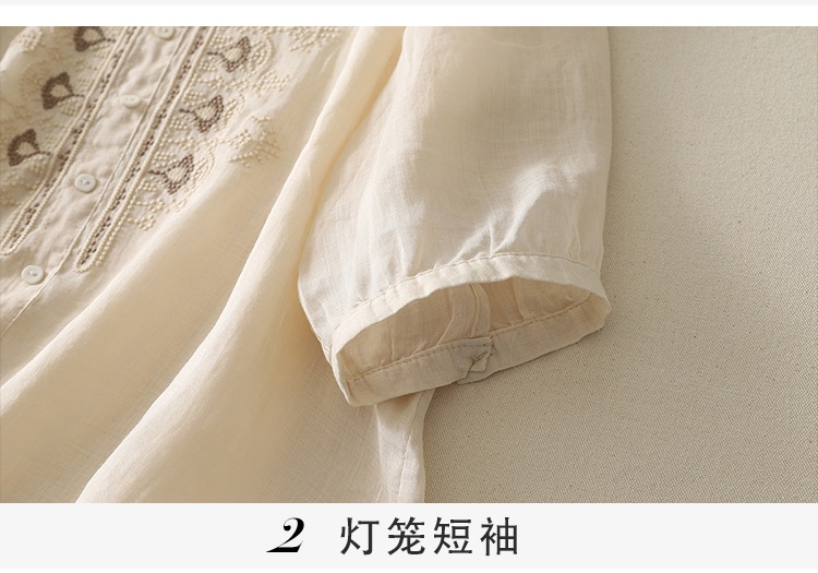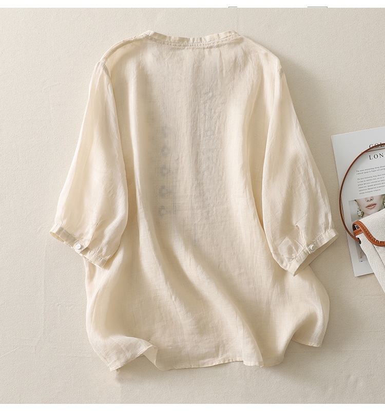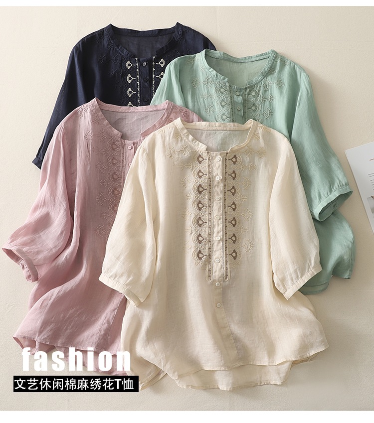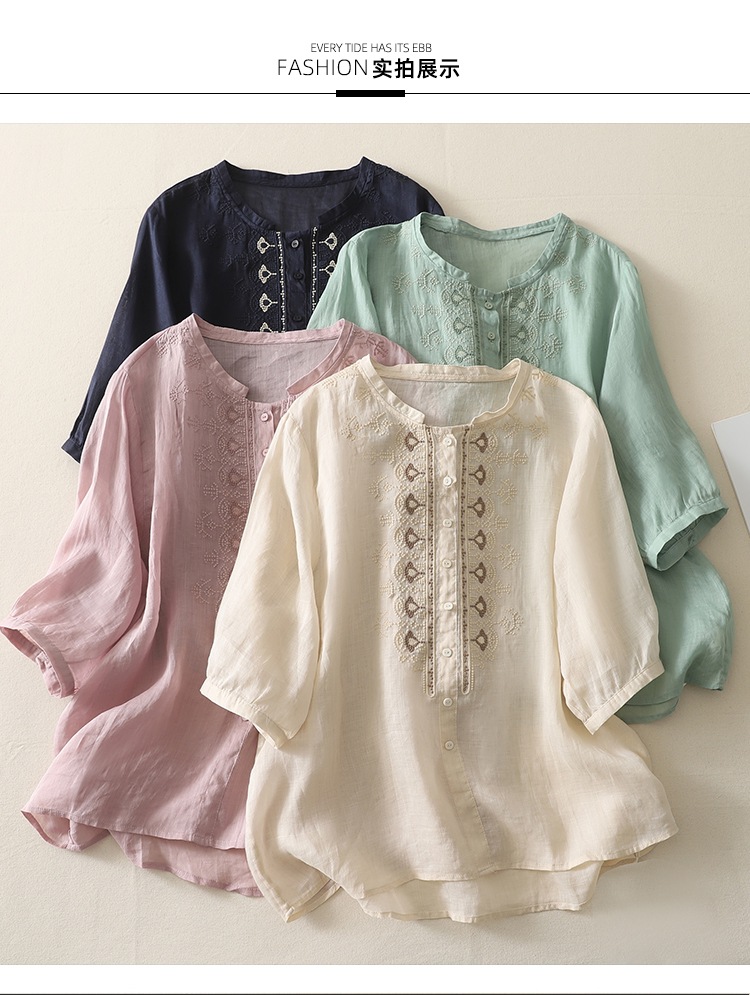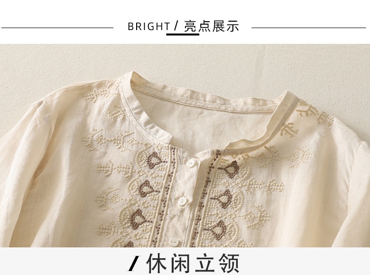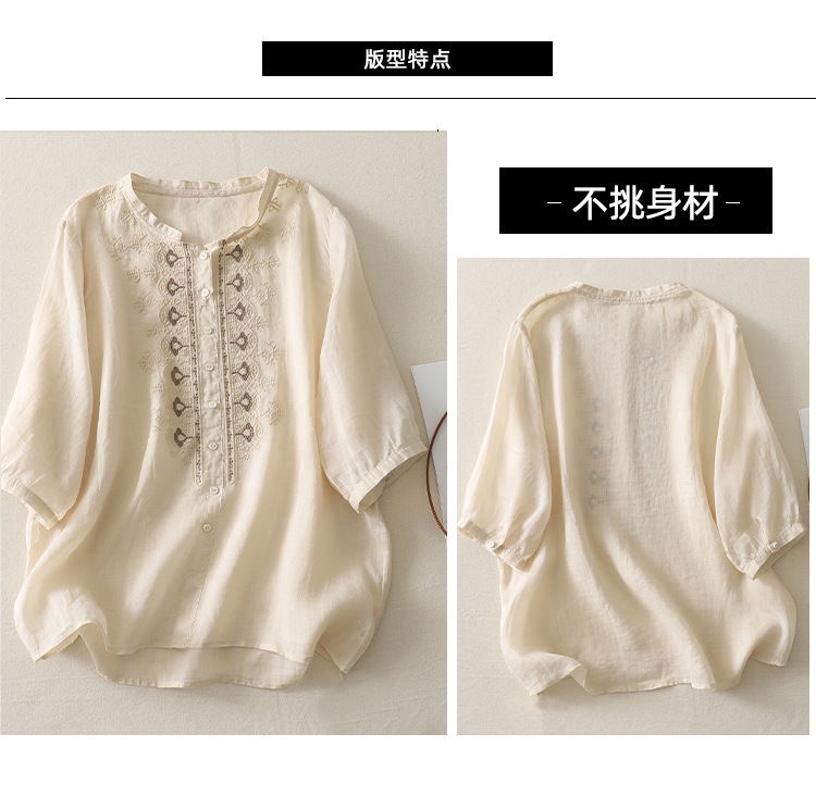 商品名称:实拍 文艺刺绣高端棉麻衬衫女纯色夏宽松显瘦五分袖轻薄小衫上衣
